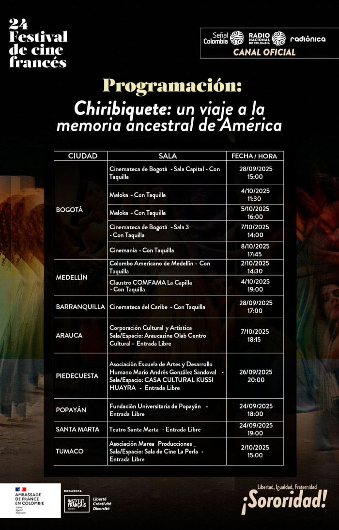 Como canal oficial de la versión 2025 del Festival de Cine Francés, RTVC, Sistema de Medios Públicos, presenta en la programación el primer documental científico ‘Chiribiquete, un viaje ancestral a la memoria de América Latina’, una coproducción de Señal Colombia, ARTE France, con Medio de contención producciones y Un film à la patte, sobre el arte indígena hallado en este parque natural declarado Patrimonio de la Humanidad, que se podrá ver en ocho ciudades del país.